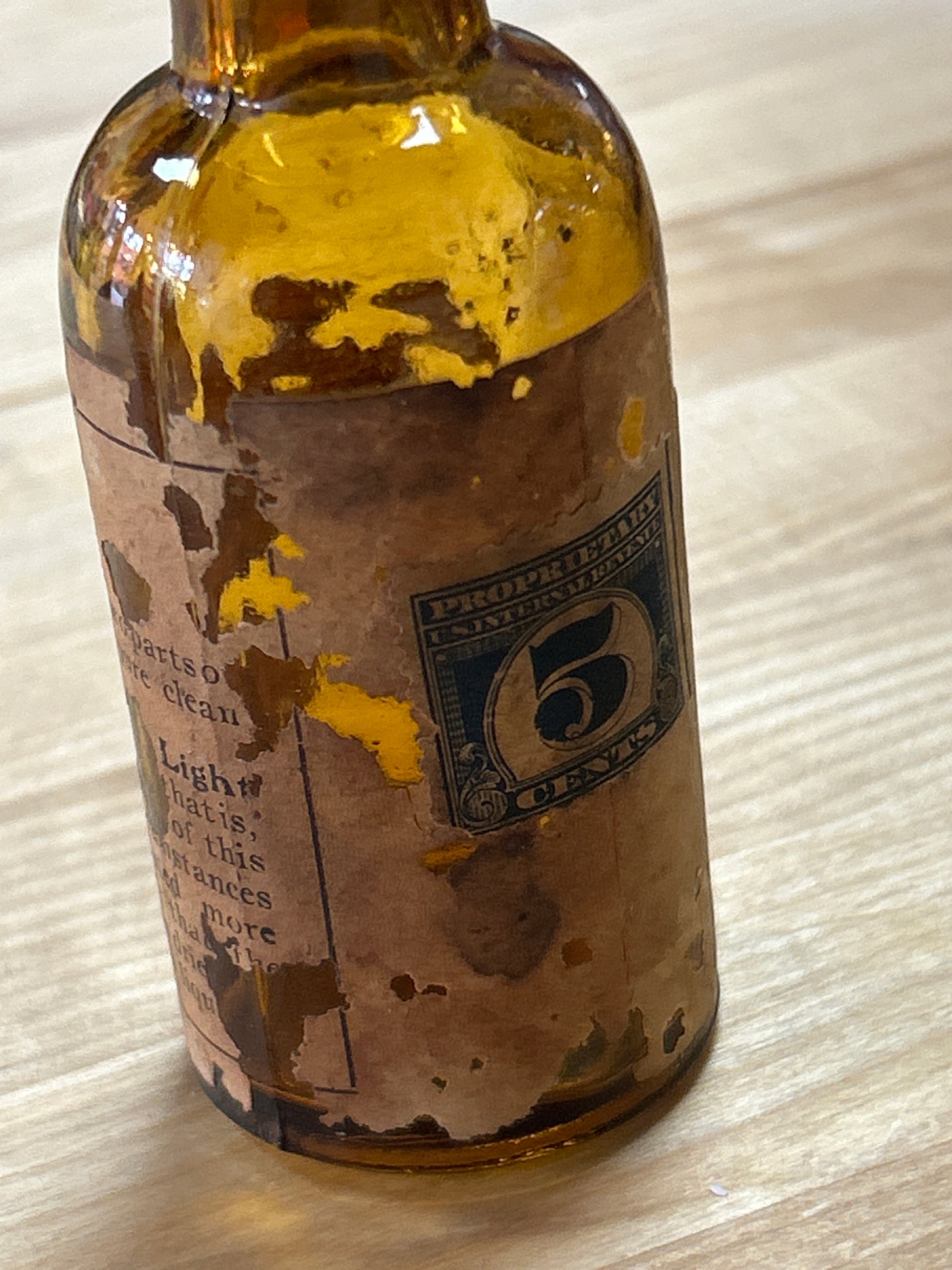 Vintage Hair Ye Bottle 4” (with 5 cent stamp attached)(not sure of maker, partial label)